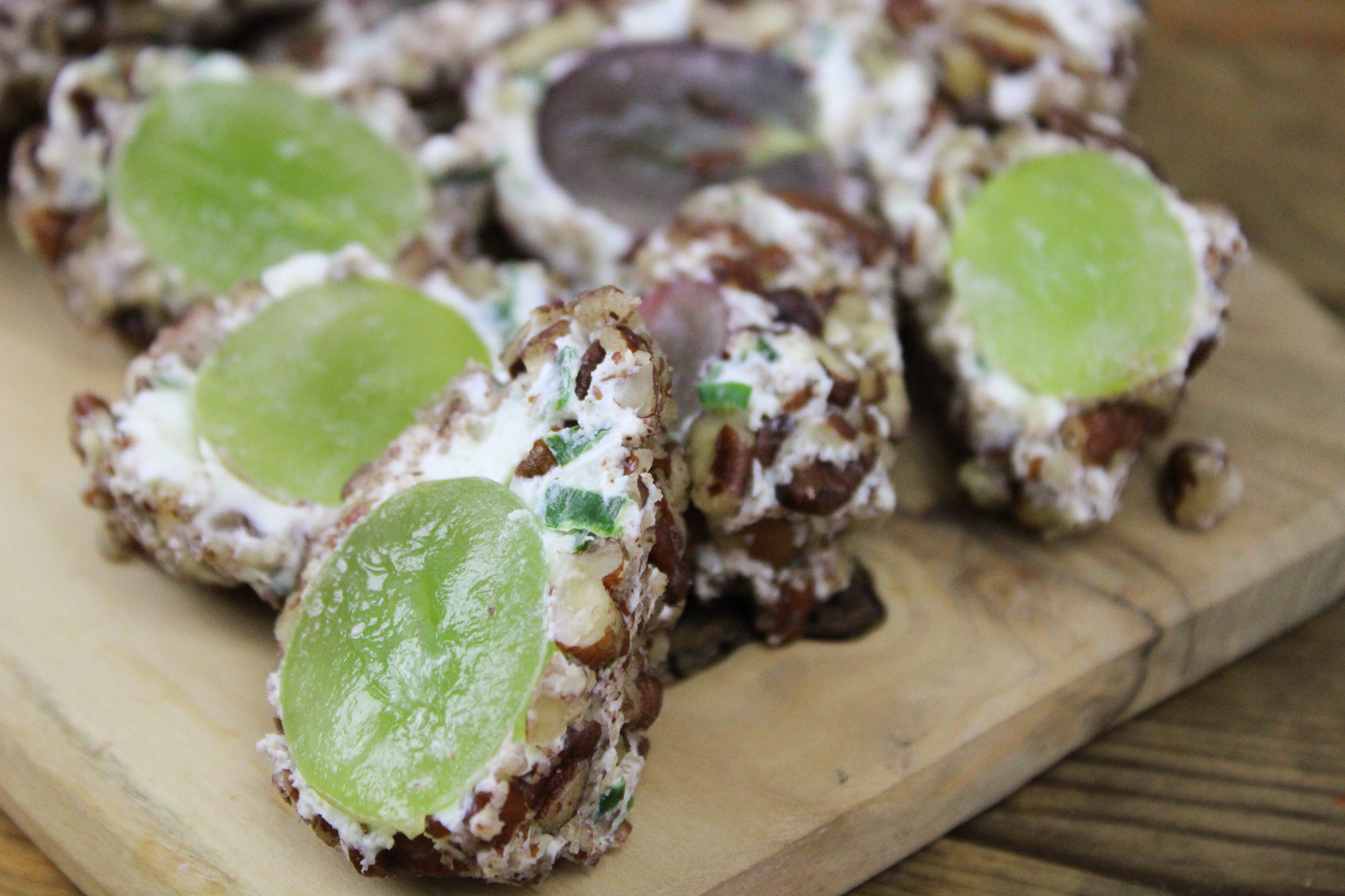 Seedless grapes covered with herbed goat cheese, minced chives or nuts