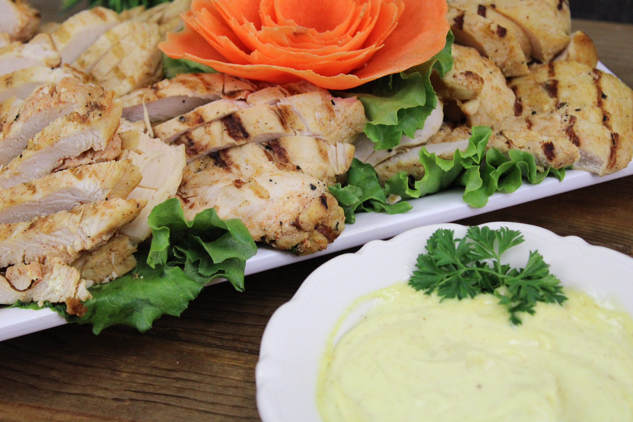 With a mild curry dipping sauce, served beautifully displayed on trays