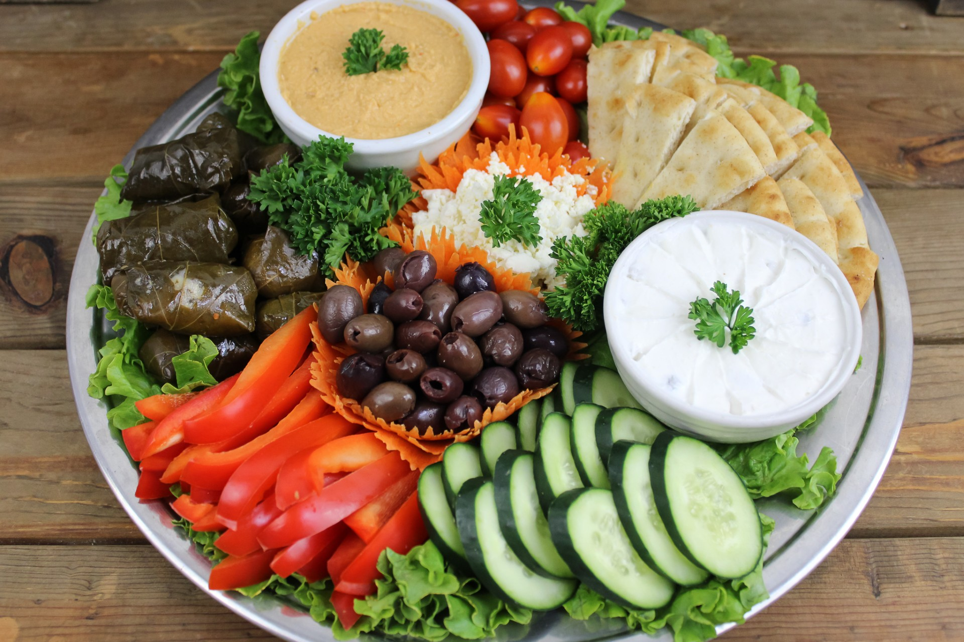 Dolmas, hummus, tzatziki, feta cheese, olives, vegetables & pita bread