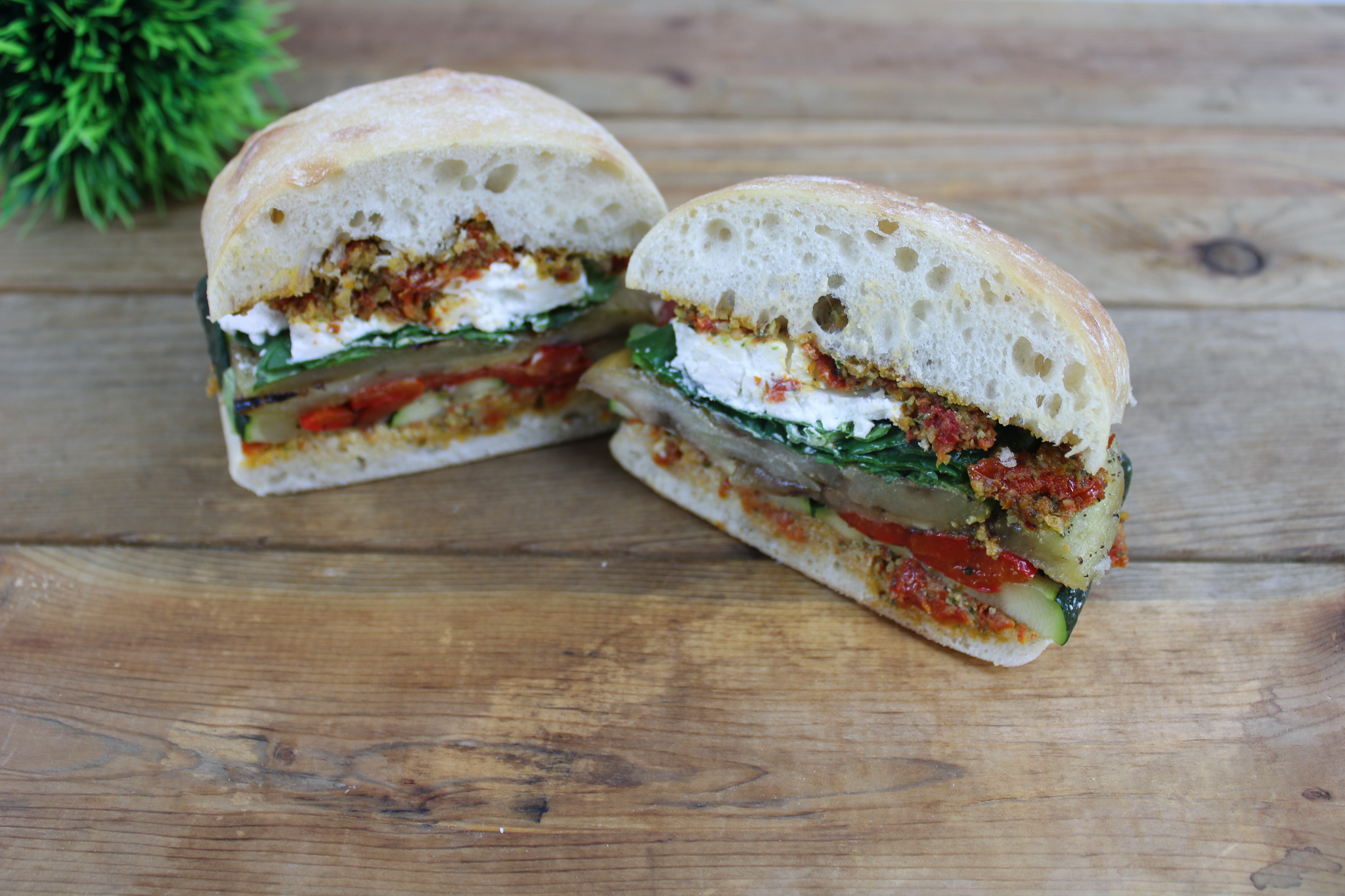 Grilled vegetables, goat cheese, spinach & house made sun dried tomato pesto on ciabatta bread
