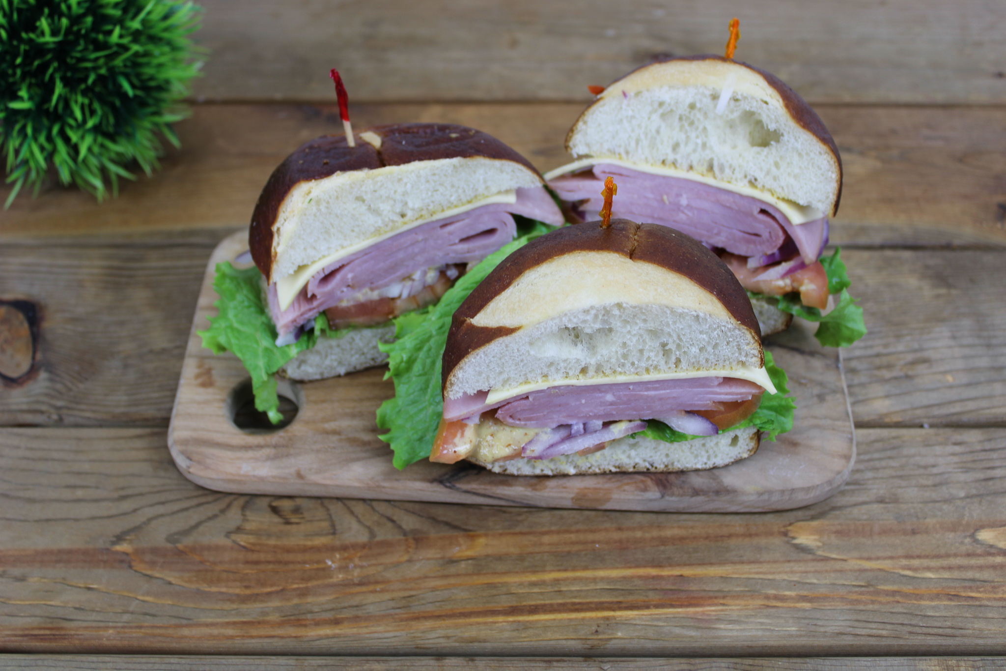 Smoked Ham, Swiss Cheese, Sliced Lettuce, Sliced Red Onion & Honey Dijon on a Pretzel roll