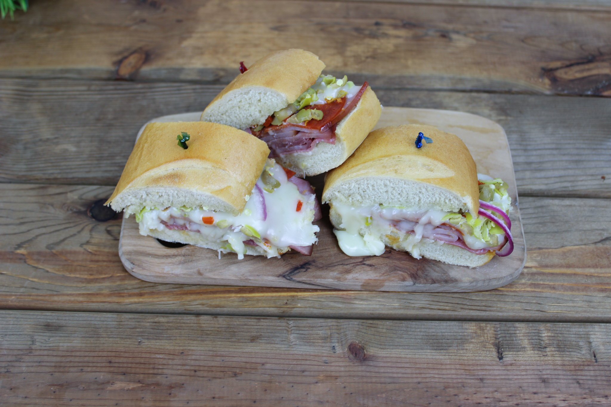Salami, ham, pepperoni, Provolone cheese, Mozzarella cheese, tomatoes, olives, red onions & pepperoncini