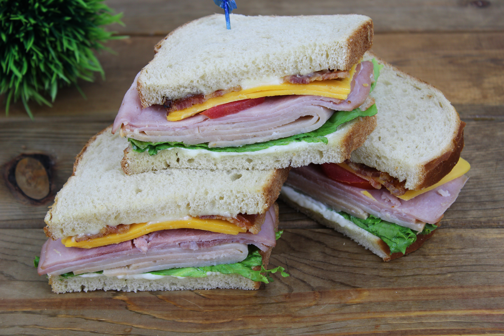 Turkey, ham, bacon, cheddar cheese, lettuce, tomato & mayo on sliced sourdough bread