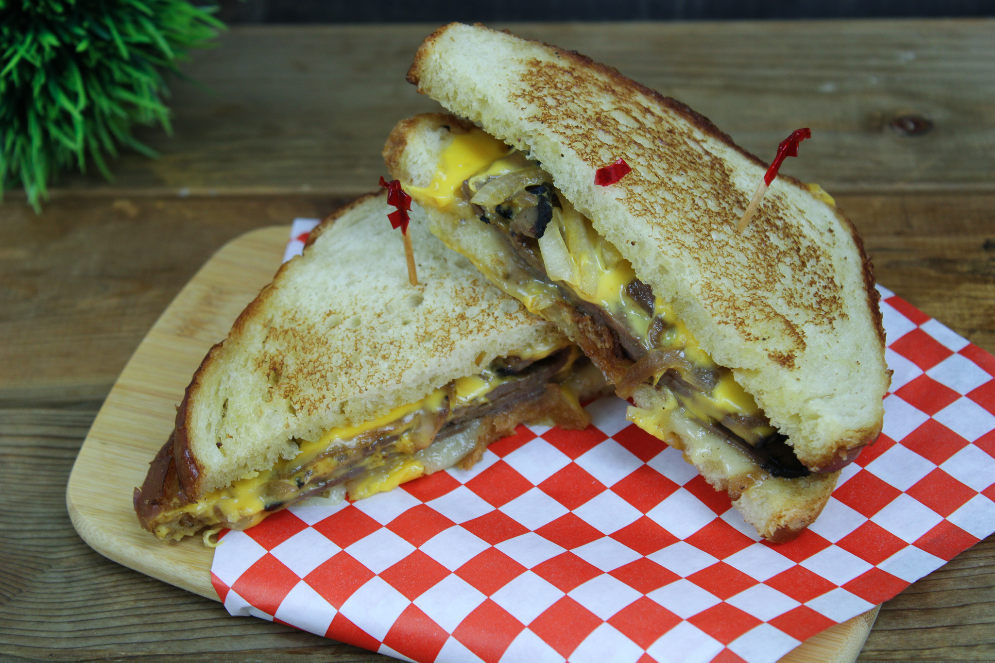 Sliced roast beef, melted Provolone and American cheese, & caramelized red onions